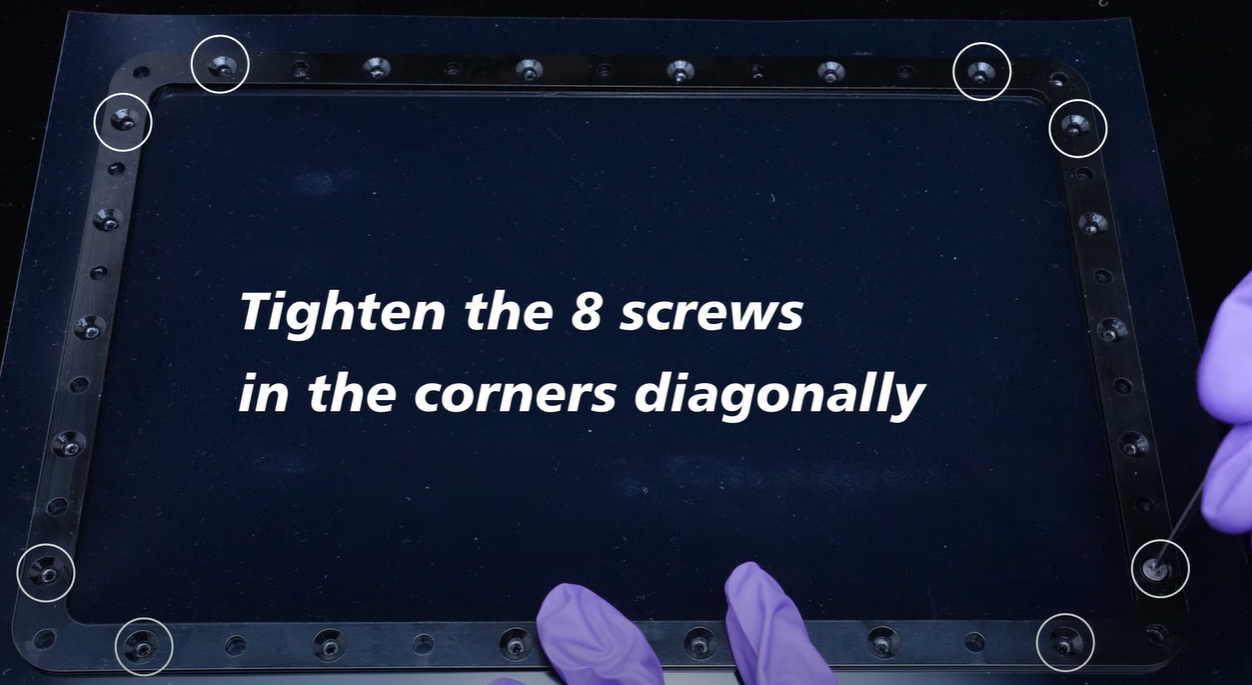 - Tighten the 8 screws located at the corners, alternating between opposite corners to ensure even tension