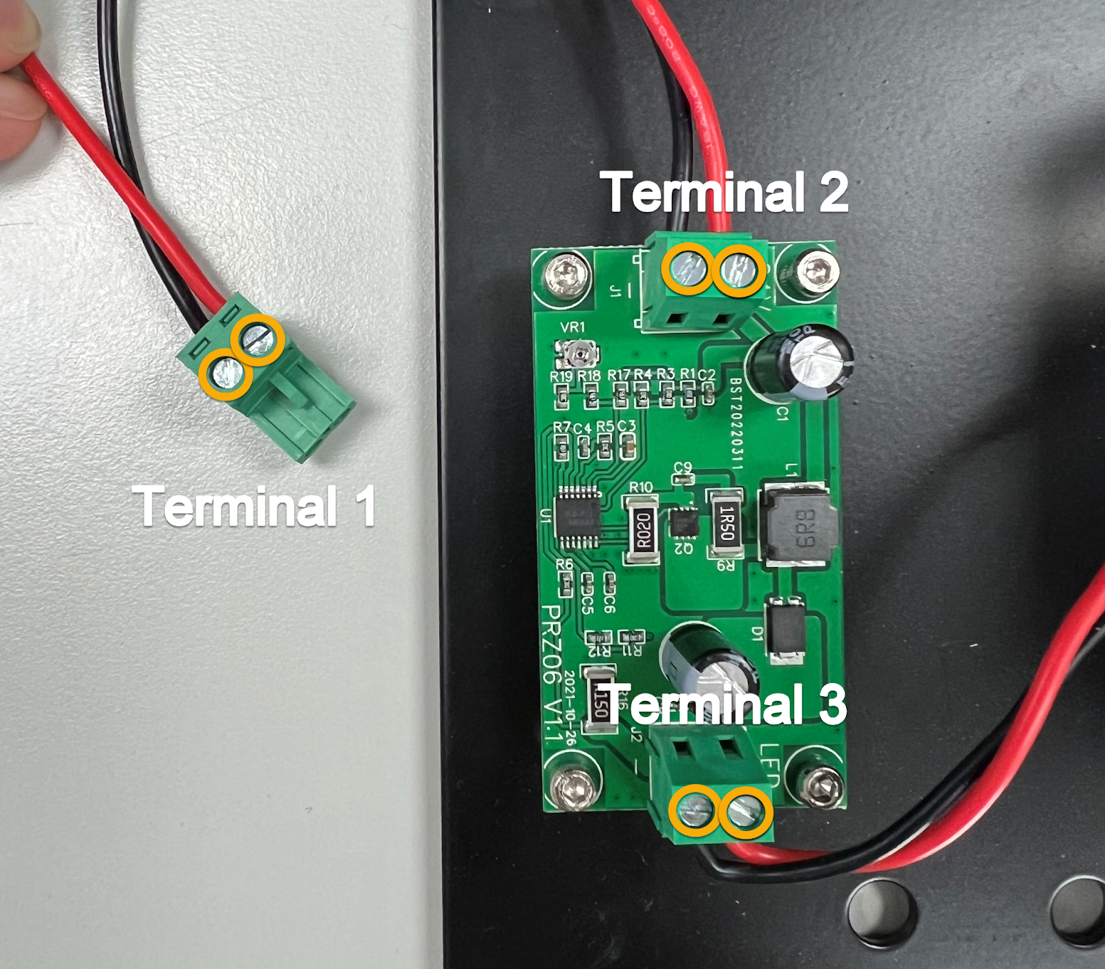 - Reattach the red & black wires on Terminal 1, Terminal 2, and Terminal 3 if the wires have become disconnected from the terminal block