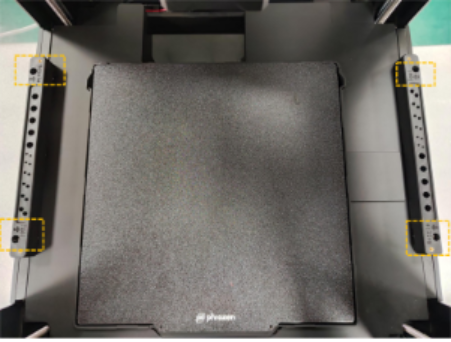 Turn the Z-axis screws at all four corners counterclockwise to lower the frame until it firmly touches the XY beam alignment brackets and can no longer be rotated downward.