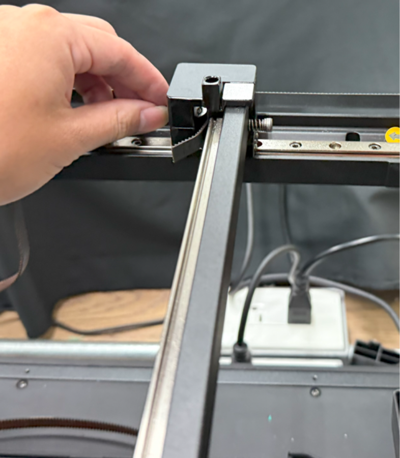 - Insert into the right slider, pull the belt through, and align it parallel to the X-axis belt.