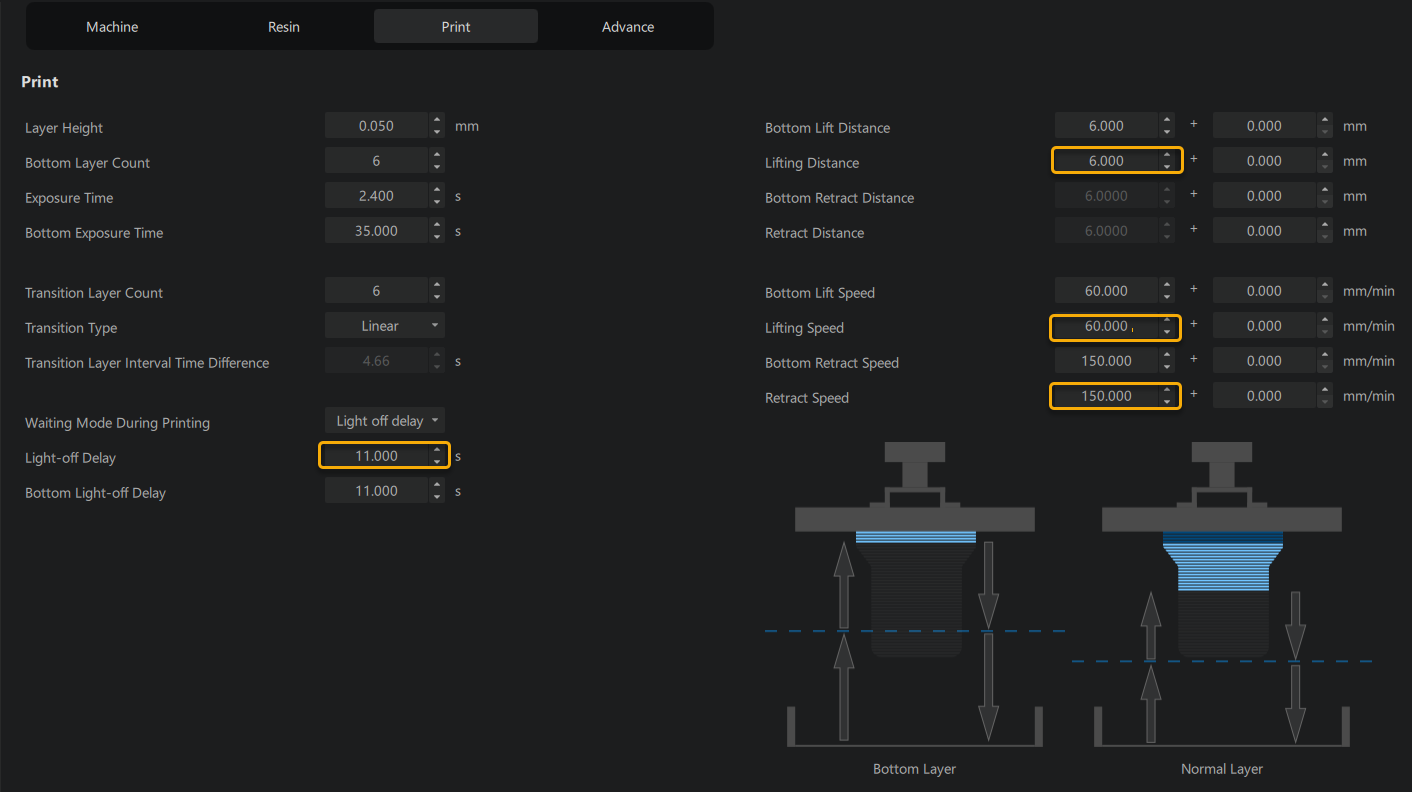 Light-off Delay refers to when the build plate lifts up, waits, and retracts while printing 3D models. If the Light-off Delay time is set too high, it will take longer to complete the process. If the number is set too low, there is a higher chance of your prints failing.