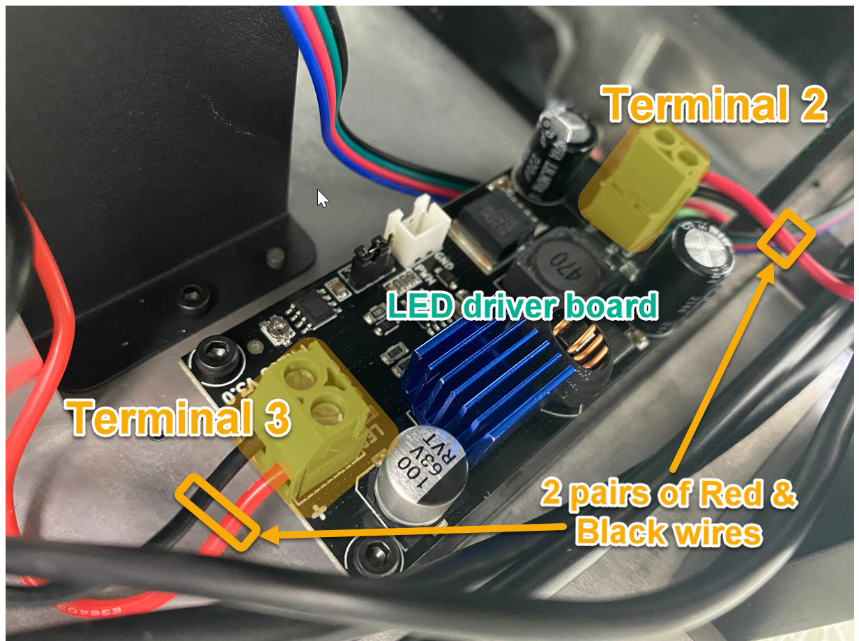 LED 连接包括三对电线。一对连接到主板,另外两对连接到 LED 驱动板。即 Terminal 1 是主板上离左边第二个的端子块,而 Terminal 2 和 Terminal 3 位于打印机背面的 LED 驱动板上。