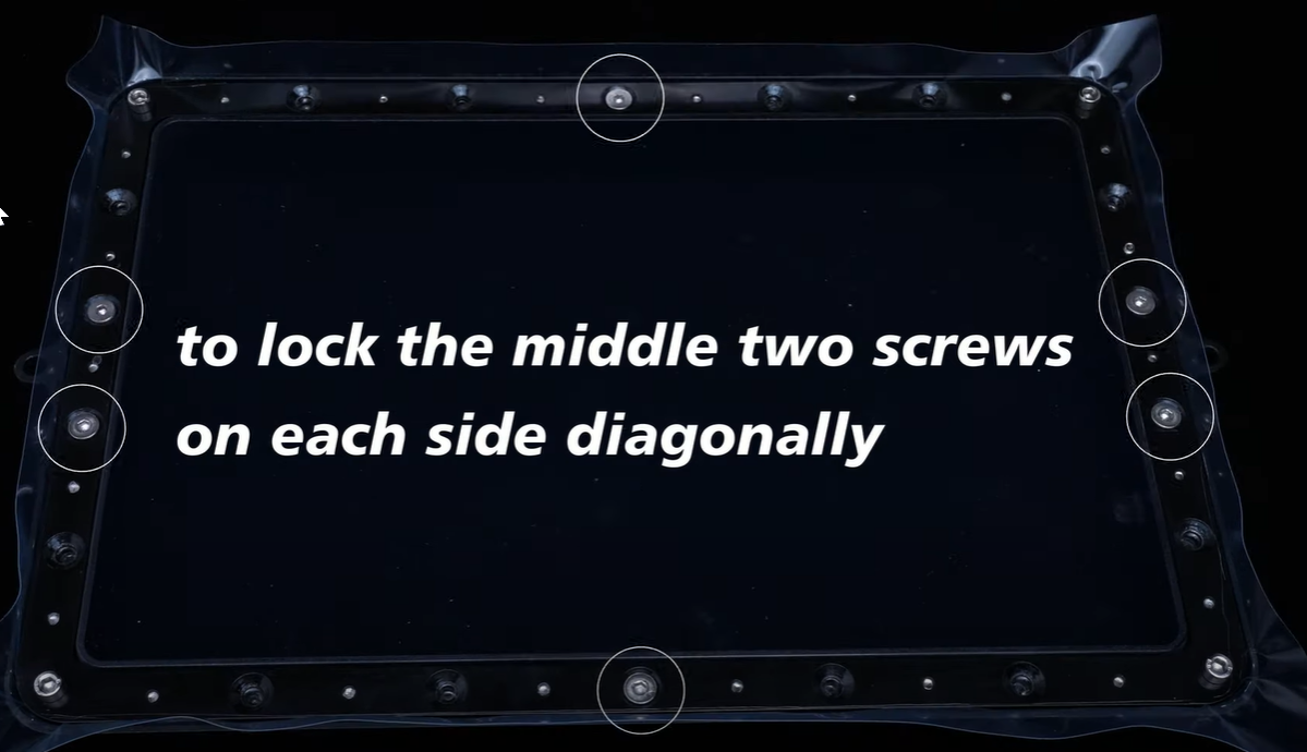 - 松紧8个位于角落的螺丝,交替夹在相对的角落以确保紧张均匀