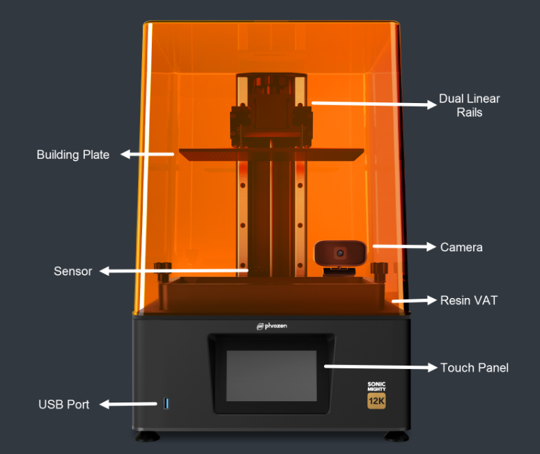 压克力罩是 3D 打印机的重要部分,因为它可以保持打印环境清洁,防止灰尘和其他颗粒混入树脂中。Sonic Mighty 12K 的另一个功能是可调节的脚,使调平更容易。Phrozen 一直致力于使 3D 打印更简单、更易于使用,因此在 Wi-Fi 和以太网络选项之上,还新增了前置 USB 孔以便于存取。