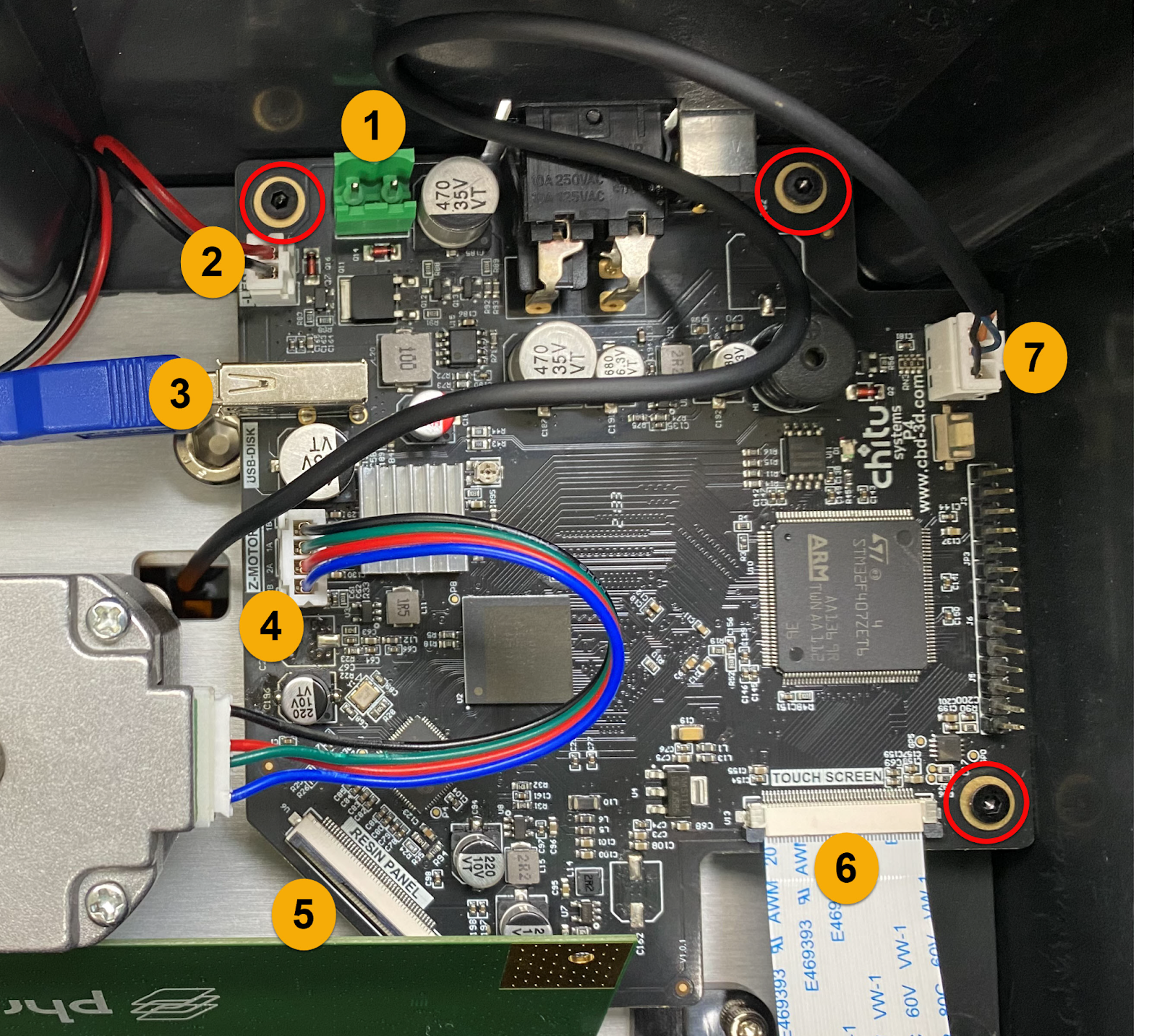 - 断开连接到主板的所有电缆/电线(1 号至 7 号) (见下图)