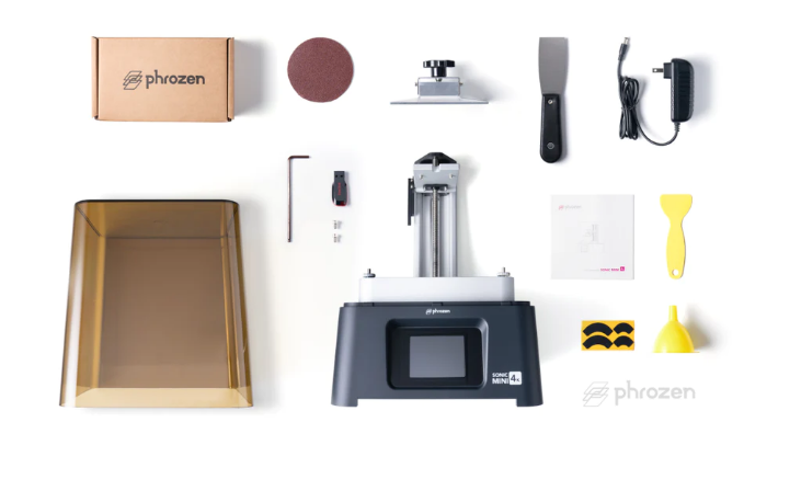 盒子内包含一台Sonic Mini 4K并用塑料薄膜包裹,附有包材以保护3D打印机。Sonic Mini 4K的工具箱放置在打印机内。