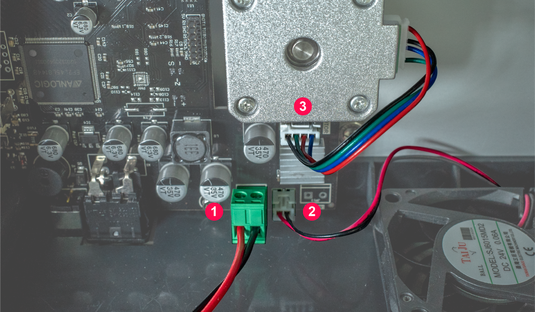 - 拔除与主板相连的 ① LED 端子和 ③ 马达端子。