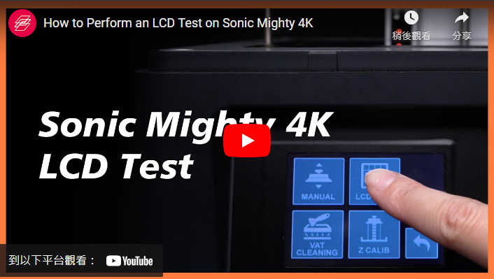 在开始打印或遇到问题时,您可能需要检查 Sonic Mighty 4K 的 LCD 屏幕状态,以确保 UV 灯和 9.3 英寸单色 LCD 屏幕是正常运作。我们将会引导您进行 LCD 测试,并解释如何评估测试结果。