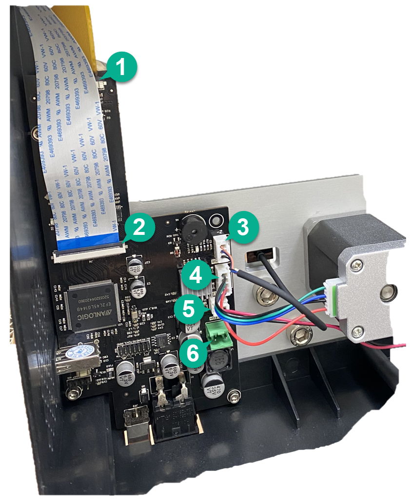 - 拆下所有与主板连接的端子/扁平电缆(参见下方绿色圆圈标示的扁平电缆1至6)。