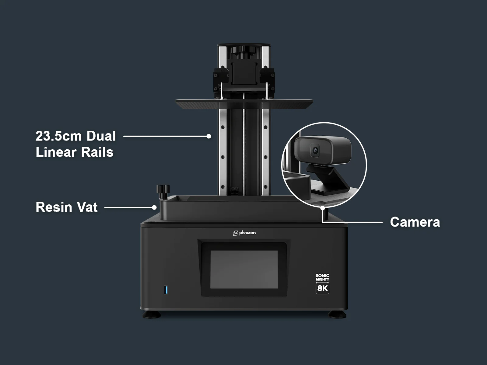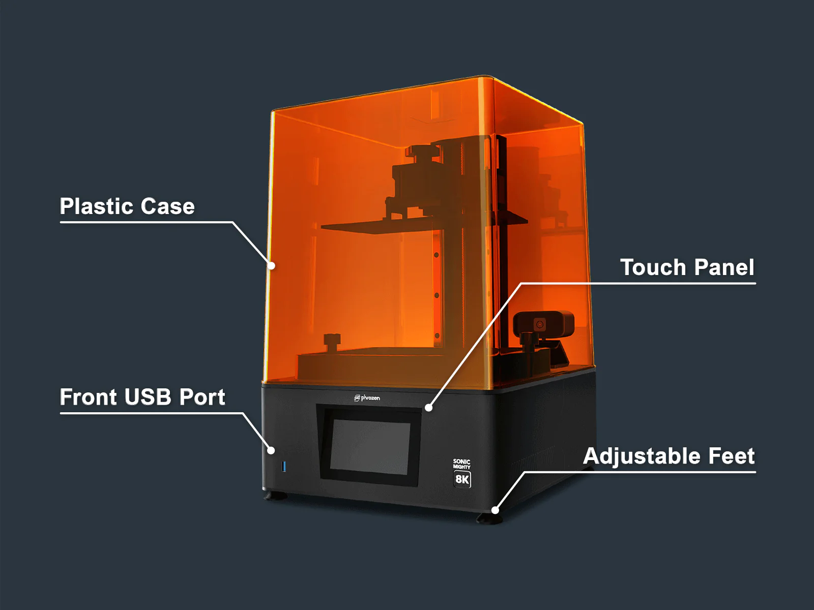 橘色的壓克力蓋是3D列印機的重要組成部分,它可以防止灰塵和其他不需要的微粒進入樹脂中,保持列印環境的清潔。Sonic Mighty 8K的另一個新功能是可調節的腳架,使調整高度更加容易。Phrozen始終致力於使LCD 3D列印更加簡便和易於使用,因此在Wi-Fi和以太網選項之外,還新增了前置USB端口以便輕鬆使用。