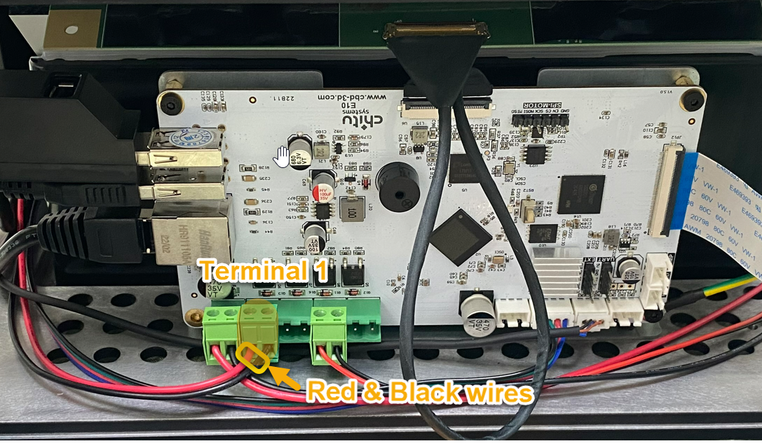 LED 連接包括三對電線。一對連接到主板,另外兩對連接到 LED 驅動板。即 Terminal 1 是主板上離左邊第二個的端子塊,而 Terminal 2 和 Terminal 3 位於打印機背面的 LED 驅動板上。