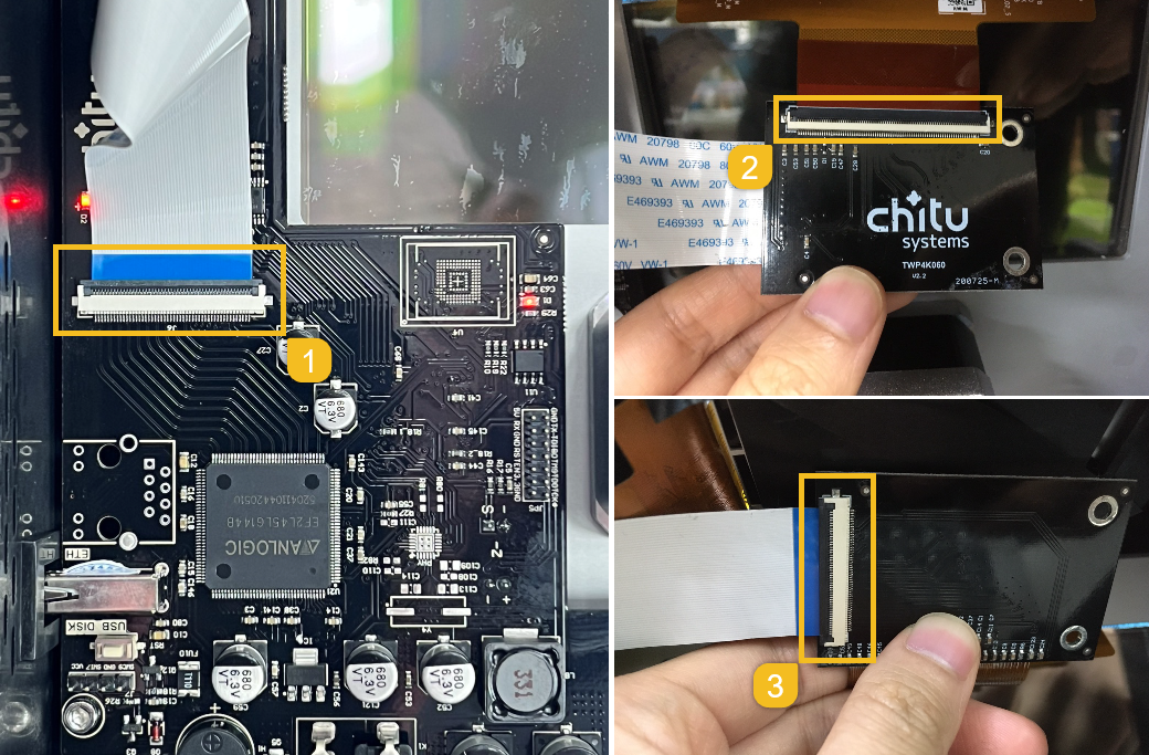 - 打開主板和拓轉板上的排線夾