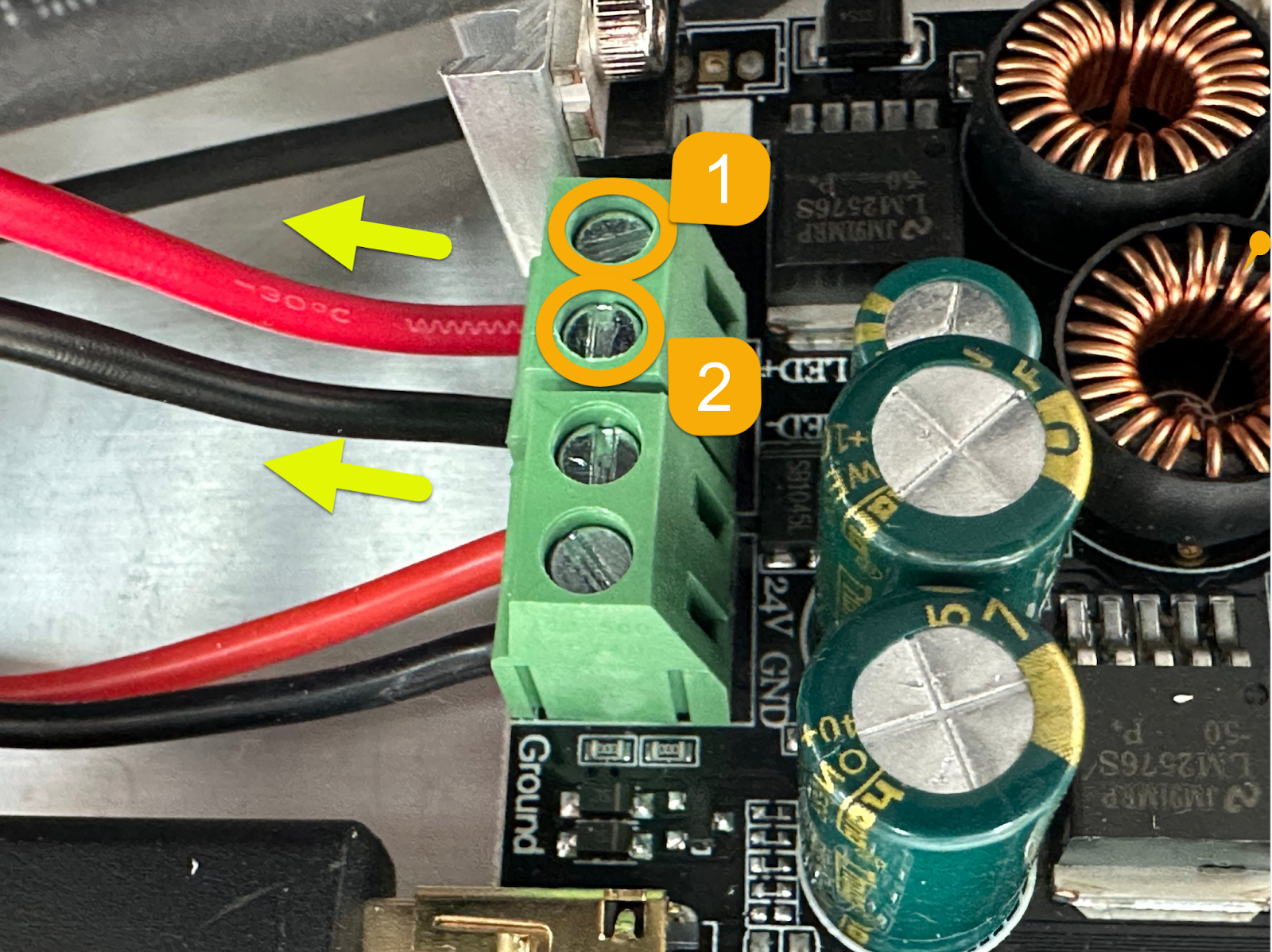 - 如果電線已經從端子塊上脫落,使用螺絲刀將它們重新連接(見下面的黃色標記)。