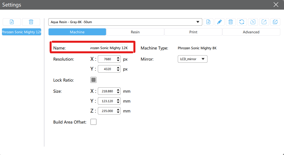 - 將印表機重新命名為 “Phrozen Sonic Mighty 12” 或您喜歡的任何名稱
