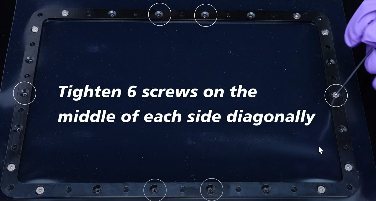 - 鬆緊8個位於角落的螺絲,交替夾在相對的角落以確保緊張均勻