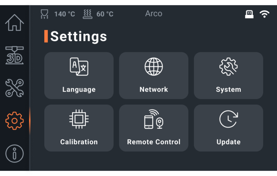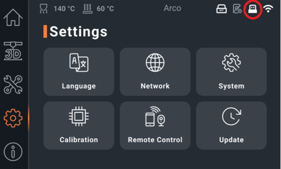 - 將 USB 插入 Arco,等待數秒後,螢幕右上角應出現 USB 圖示,表示機台已成功辨識 USB。